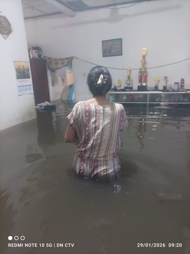 Genangan air setinggi 30 hingga 60 sentimeter merendam jalan lingkungan dan rumah warga, menyebabkan akses terputus serta aktivitas masyarakat lumpuh. Sebagian warga memilih bertahan di lantai dua rumah sambil menyelamatkan barang-barang berharga dari terjangan air.